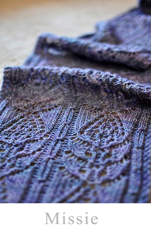 Missie is a rectangular shawl that has the same lace stitch as Frangipani. For knitters who like wearing rectangular shawls, this is a good pattern to try out. A skein of Madelinetosh Sock Logwood is used for my Missie and it is so soft and light weight.